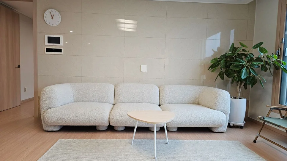 33평 아파트에 도착하자 맨 처음 다가온 쪽빛의 푸른 중문이 생소한 여행 숙소에 도착한 마음을 평온하게 해주었어요. 새 아파트이고 모든 것들이 깨끗하고 고급스러웠어요.