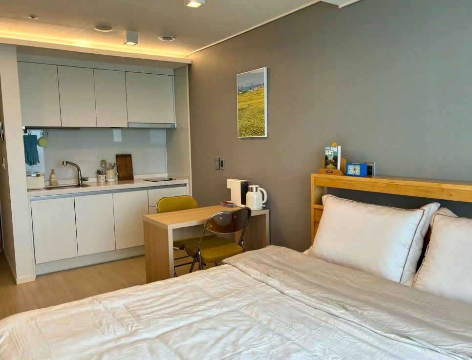 킹사이즈 침대와 침구류가 너무 편안했고 깔끔한 화장실과 주방이 만족스러웠습니다. 1층 주차장에 주차시설도 만족스럽고 주변으로 해녀의 집 등 먹고 즐길 거리가 많아 너무 편리했습니다. 쿠팡이츠 배민 요기요 등등 모든 배달 음식도 가능하고 동쪽 서쪽 서귀포로 나가기에도 위치상 중간 지점이라 계획 짜기에도 용이하네요. 다음 제주 방문에도 재방문의사 1000%인 숙소입니다 :)