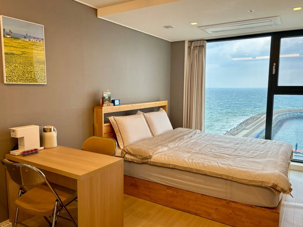 일주일 숙소로 예약했습니다. 일단 방에 들어서자마자 통창으로 보이는 제주 큰바다 뷰가 예술입니다. 바로 앞 방파제 뷰는 밤에 조명이 더하여 숙소에서 바다멍만 해도 시간 가는 줄 몰랐습니다.