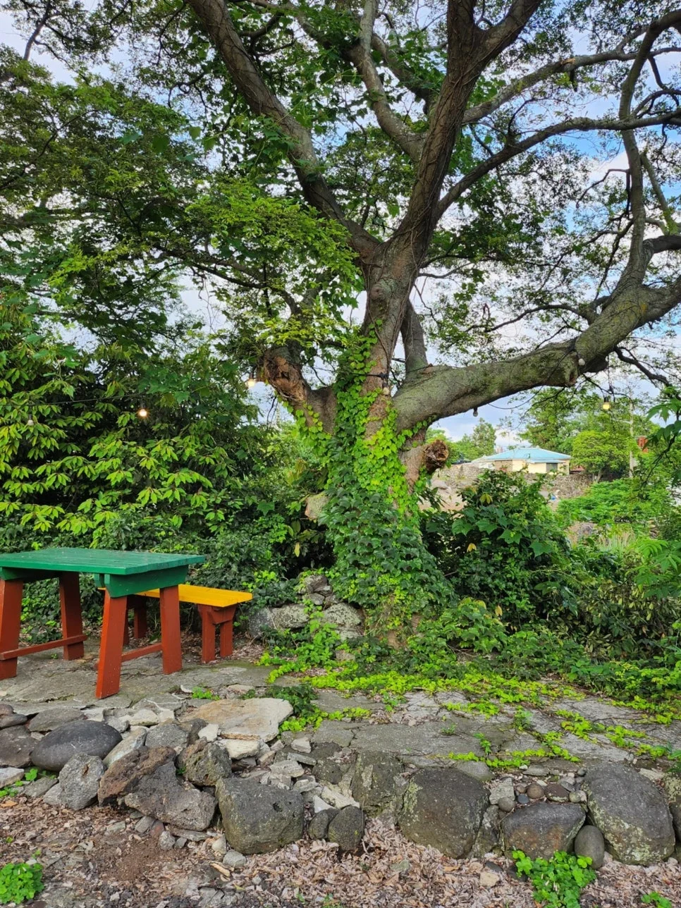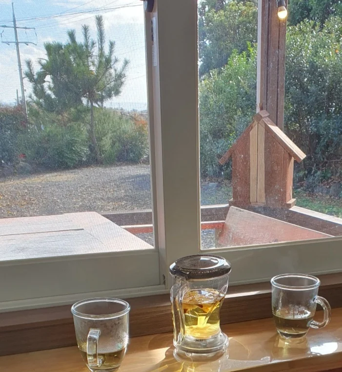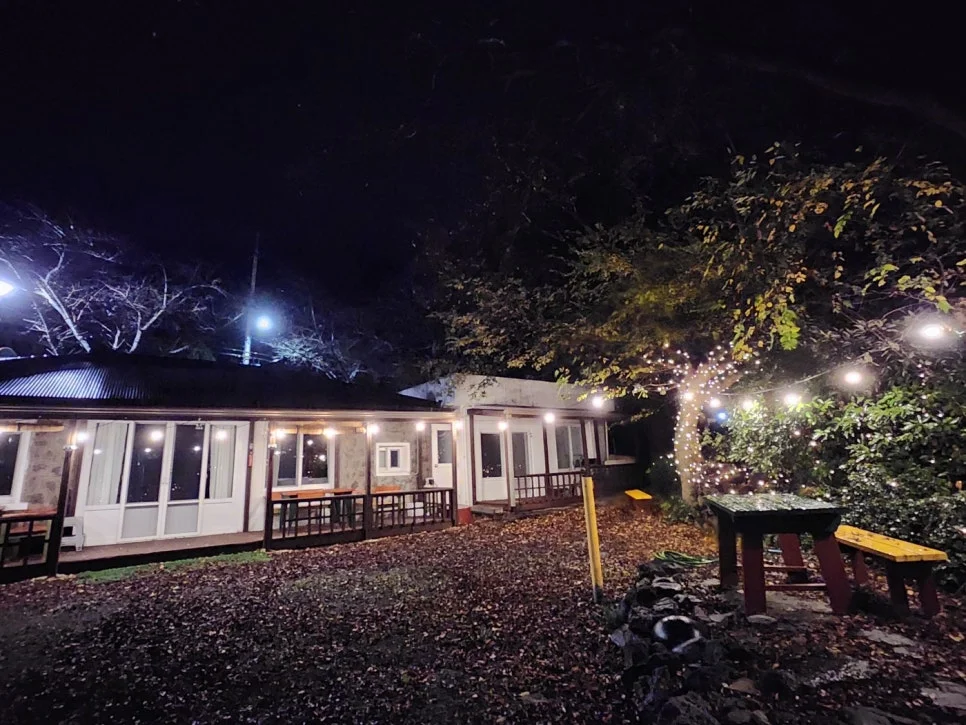 시골 아닌 시골이라 맘껏 제주 감성을 누릴 수 있으며 집에서 논짓물바다 수평선이 보입니다. 처마에 달린 풍경이 바람에 흔들리면 숲속 작은집 동화 속에 사는 느낌 같습니다. 추운 바람에도 우리 집은 아늑하게 담과 나무로 둘러싸여 있어 바람을 잘 느끼지 못합니다. 분위기 있는 마당에서 불멍하거나, 바베큐 하기 좋습니다. 마당이 너무 예뻐 밤에는 카페 같아요!