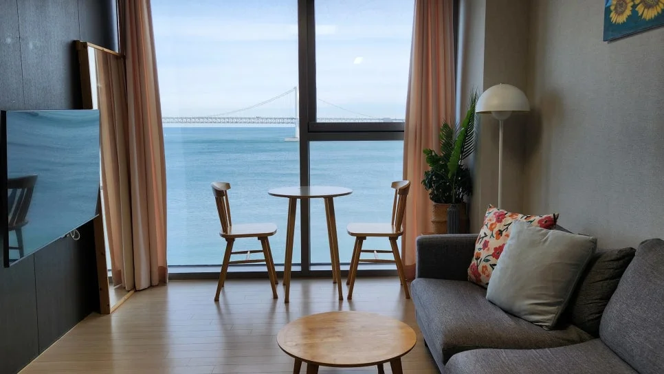 따로 오션뷰 카페를 찾아다닐 필요 없이 숙소에서 커피 한 잔 마시며 노트북 작업하는데, 이게 바로 '워케이션'이구나 싶더라고요. 내부 청결도 도 사진 그대로 깔끔하고 필요한 집기류는 다 갖춰져 있어서 호스트와 따로 연락할 일이 없어서 머무는 내내 편안했습니다.